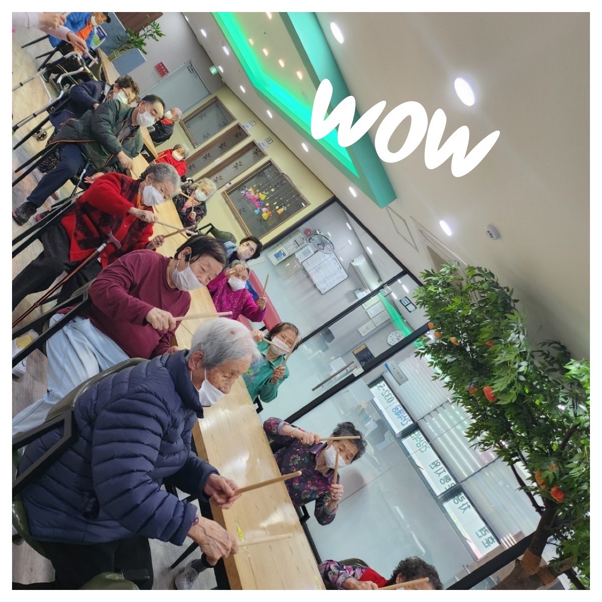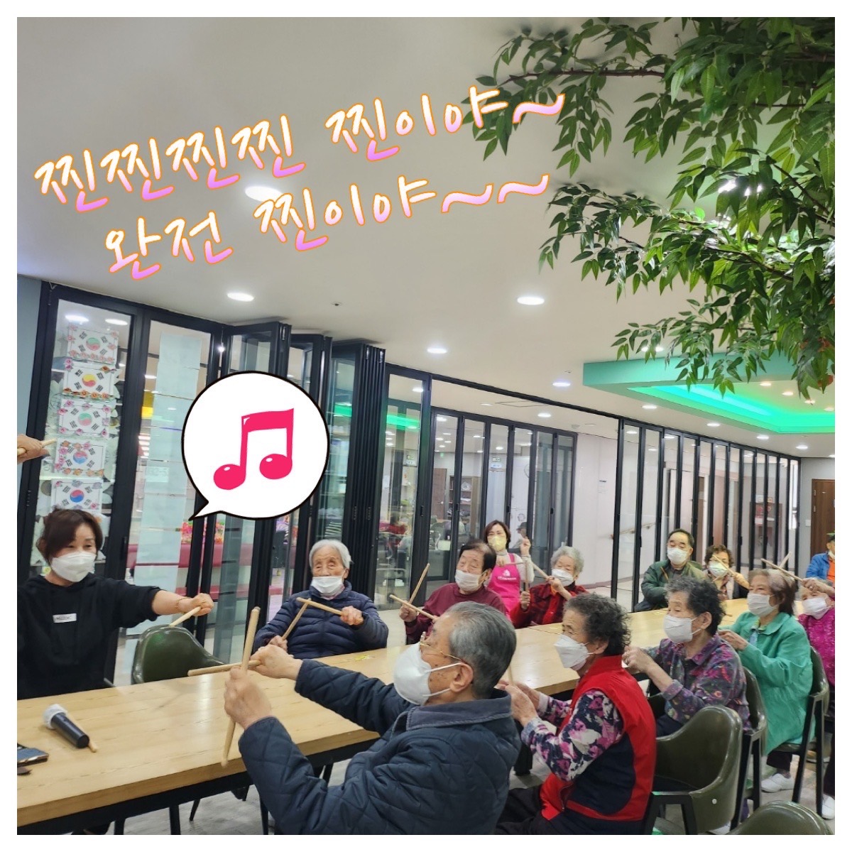 신나는 트로트에 맞추어 리듬에 몸을 맡기며 막대를 두드리는 어르신들이 완전 신나 보이네요~